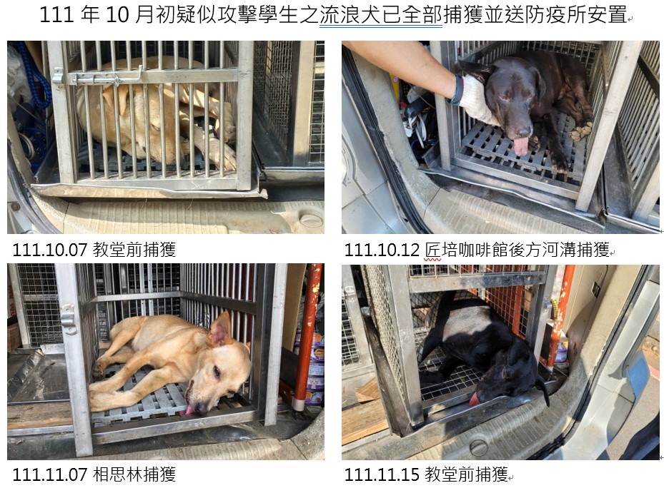 111年10月初疑似攻擊學生之流浪犬已全部捕獲並送防疫所安置,捕捉時間及地點如相片附註。